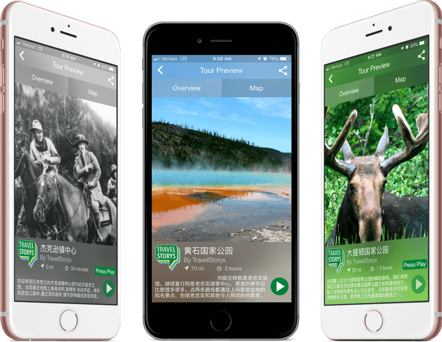 TravelStorysGPS的应用程式现在提供夹克逊霍尔, 大提顿国家公园, 黄石国家公园的中文自助语音导览 。这些导览将在旺季中提供中国游客文化和资源的资讯以鼓励及增进旅行中的互动和体验。感谢当地社区赞助商的慷慨支持。
